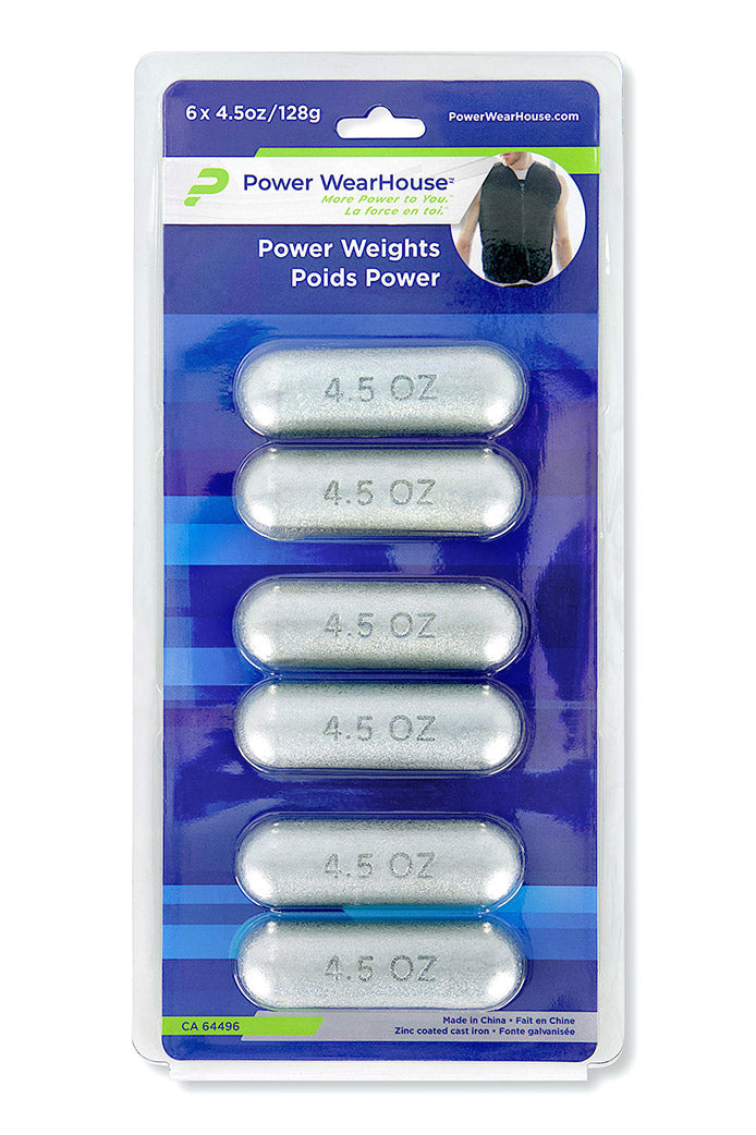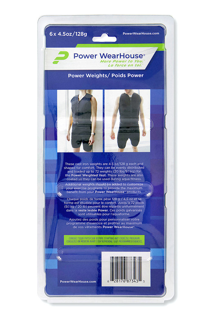 Our single packs of Power Weights come in 6 x 4.5 oz (128 g) increments to allow for ultimate flexibility in both load (up to 20 Ibs | 9 kg) and distribution for your Power Weighted Vest. They are designed to fit comfortably against your body and are secured in pockets to eliminate shifting and to produce a comfortable, no worries fit.
